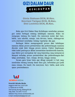 Nama Penulis: Ginta Siahaan DCN, M.Kes., Novriani Tarigan DCN, M.Kes., Dini Lestrina DCN, M.Kes. Nama Penerbit: WINEKA MEDIA Jumlah Halaman: 179 Ukuran: B5 (17 x 25 Cm) Harga: Rp. 99.000 ISBN (masih dalam proses), Sinopsis Singkat: Buku ajar Gizi Dalam Daur Kehidupan membahas peranan gizi untuk berbagai rentang kehidupan manusia. Buku ini mengupas tentang ibu… selengkapnya